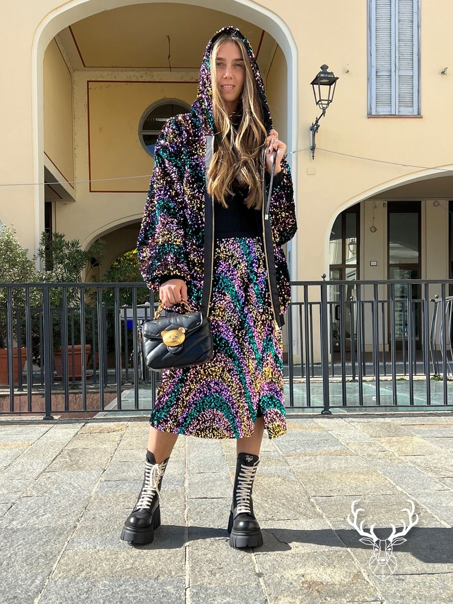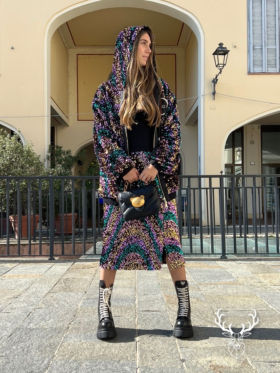 Completo in paillettes multicolor formato da felpa over e longuette il tutto firmato 5Progress, per le vostre giornate punk-rock abbinato all'anfibio nero Aniye By.